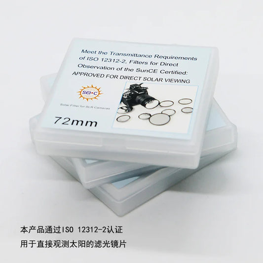 Explore the cosmos safely with our Astrophotography Solar Filters for DSLR camera lenses. Designed to capture the sun's majestic beauty without compromising your equipment or vision, these specialized filters ensure crisp and clear solar photography. Ideal for both amateur astronomers and seasoned photographers, our solar filters provide crucial protection by reducing harmful solar radiation while enhancing solar details such as sunspots and granulation. Elevate your astrophotography endeavors and discover the wonders of solar photography with confidence using our premium Astrophotography Solar Filters, crafted to deliver stunning, high-definition images of our nearest star.