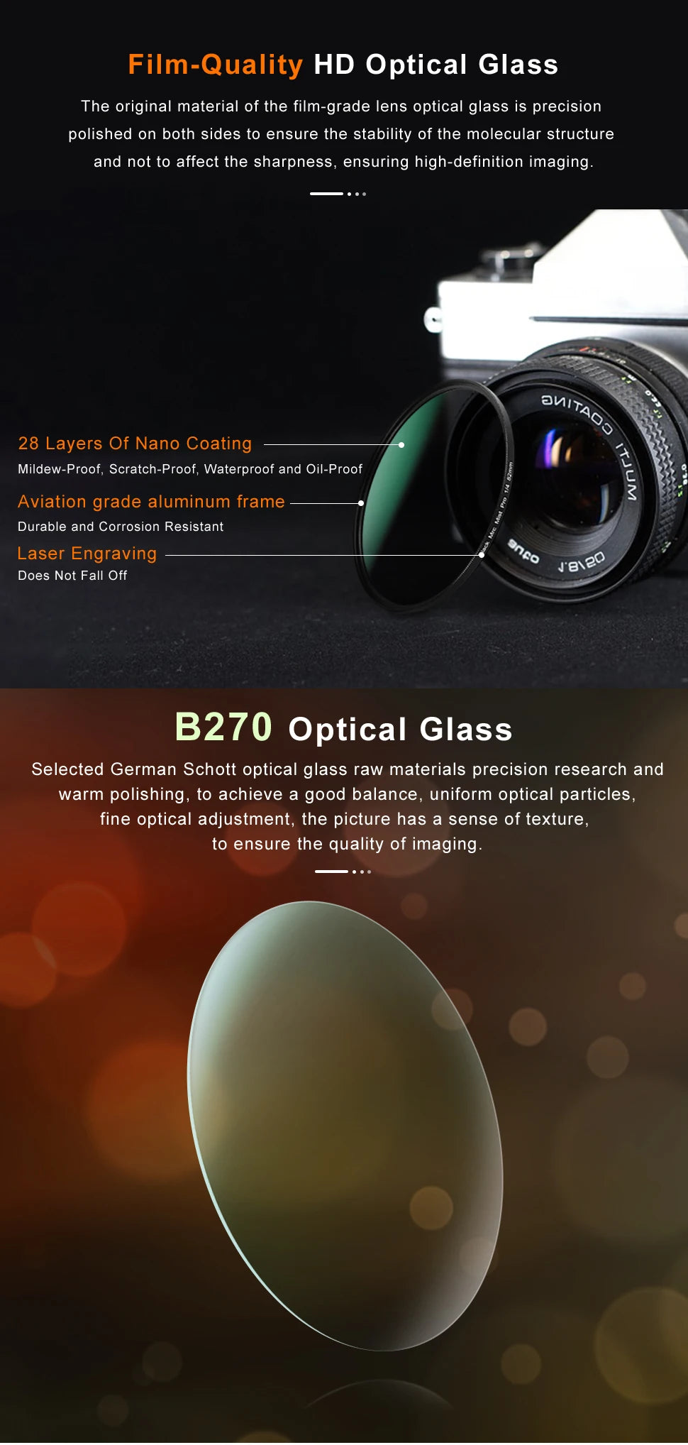 - Ultra-Slim Frame: Constructed from aviation-grade aluminum, with a frame width of only 5.5mm to prevent dark corners on wide-angle and long focal lenses.