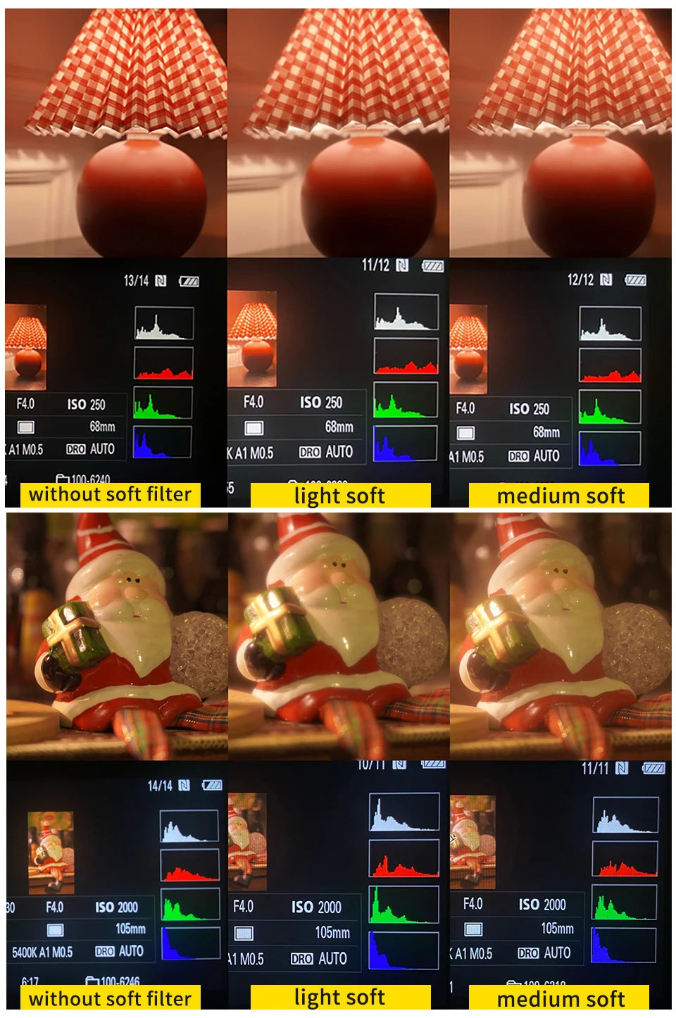 Recommended for use in various lighting conditions, the filter excels in both outdoor settings with bright sunlight and indoor environments with varying light strengths. Photographers can select between light soft and medium soft filters to achieve the desired softening effect based on specific shooting conditions.
