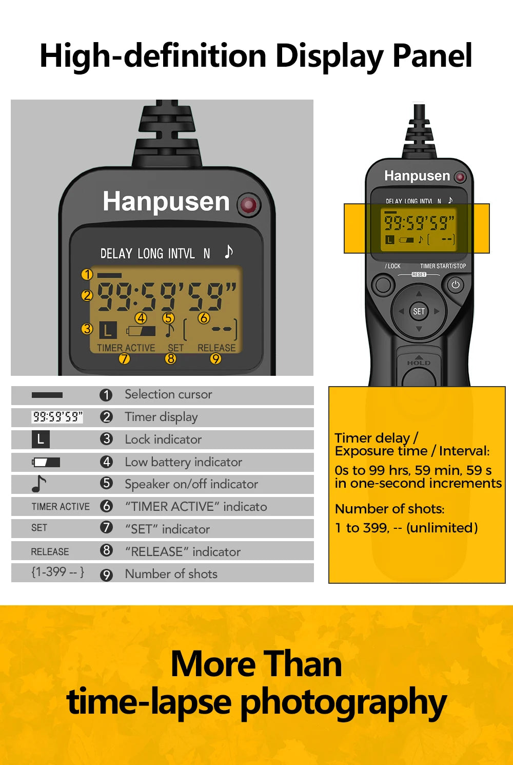 Precision Timing: The intervalometer allows you to set exact intervals and delays for shutter release, ensuring you never miss the perfect moment.