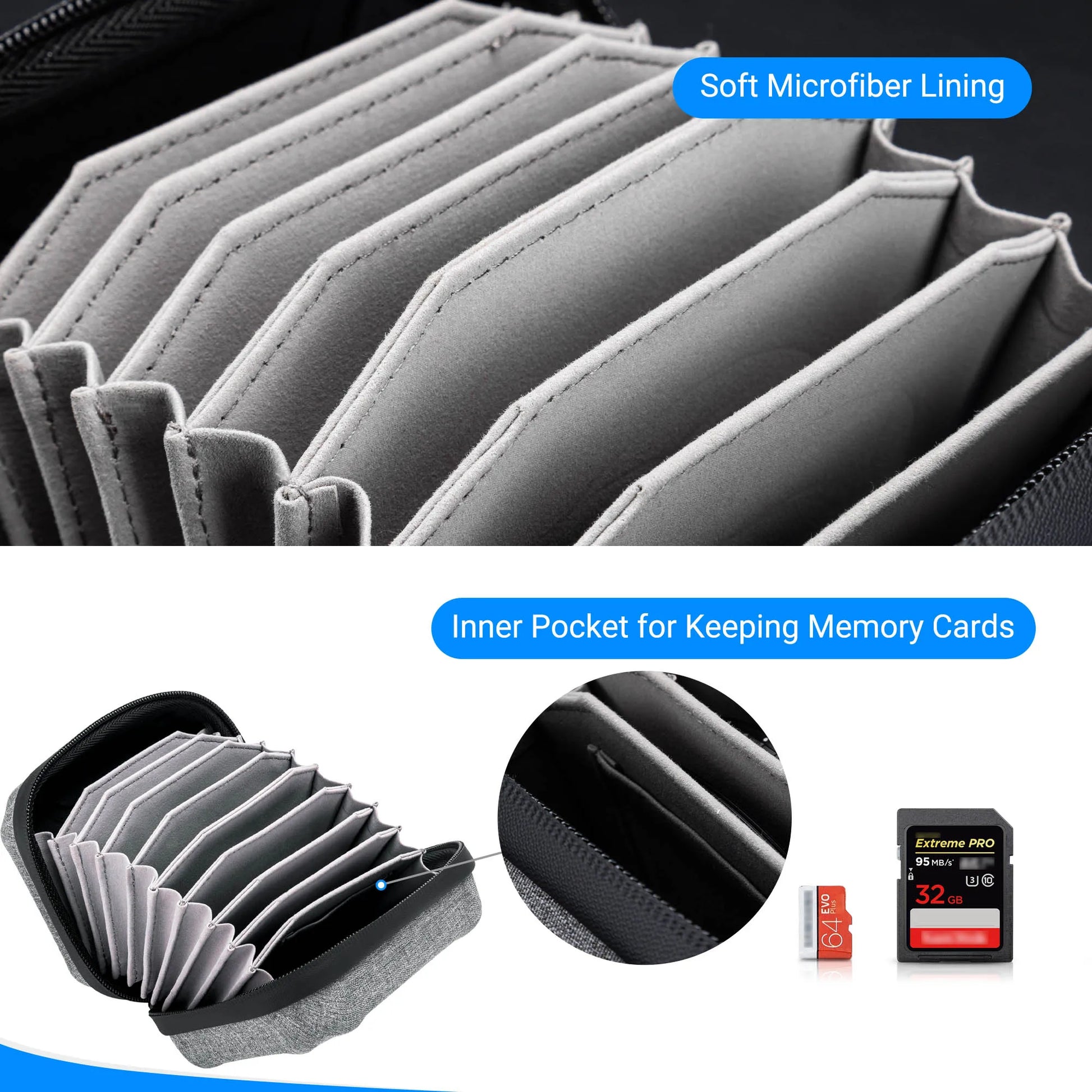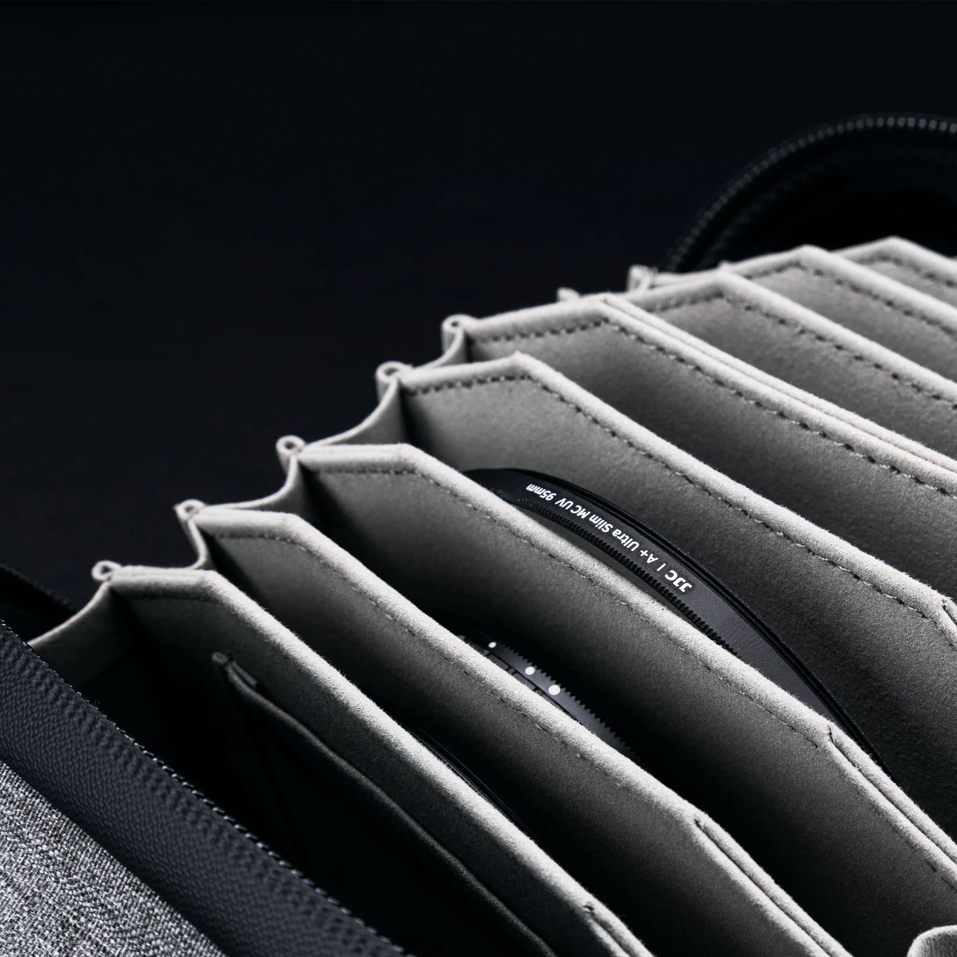 Inside the pouch, microfiber-lined accordion pockets feature ten independent slots, each designed to securely hold a filter. The microfiber lining prevents filters from touching each other, minimizing the risk of scratches and ensuring that each filter remains in pristine condition. This organizational feature keeps your filters well-organized and readily accessible, allowing you to locate the desired filter with ease.
