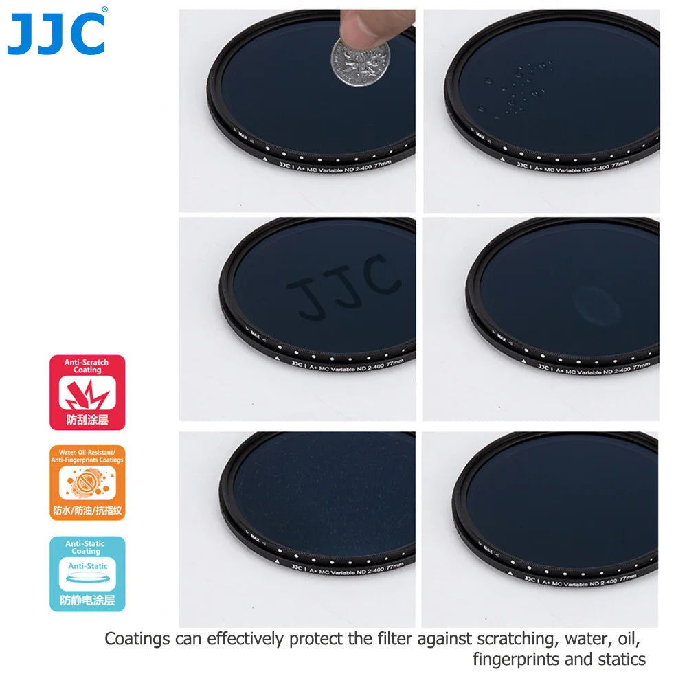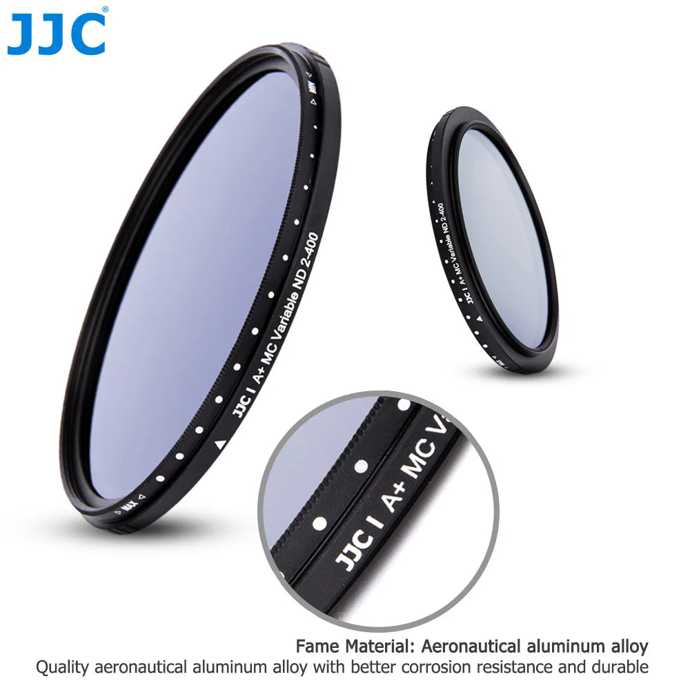 - Wide Compatibility: Available in various thread diameters from 49mm to 82mm, the JJC Variable ND Filter is compatible with a wide range of camera lenses. Each filter includes corresponding lens cap sizes to ensure hassle-free attachment and protection.