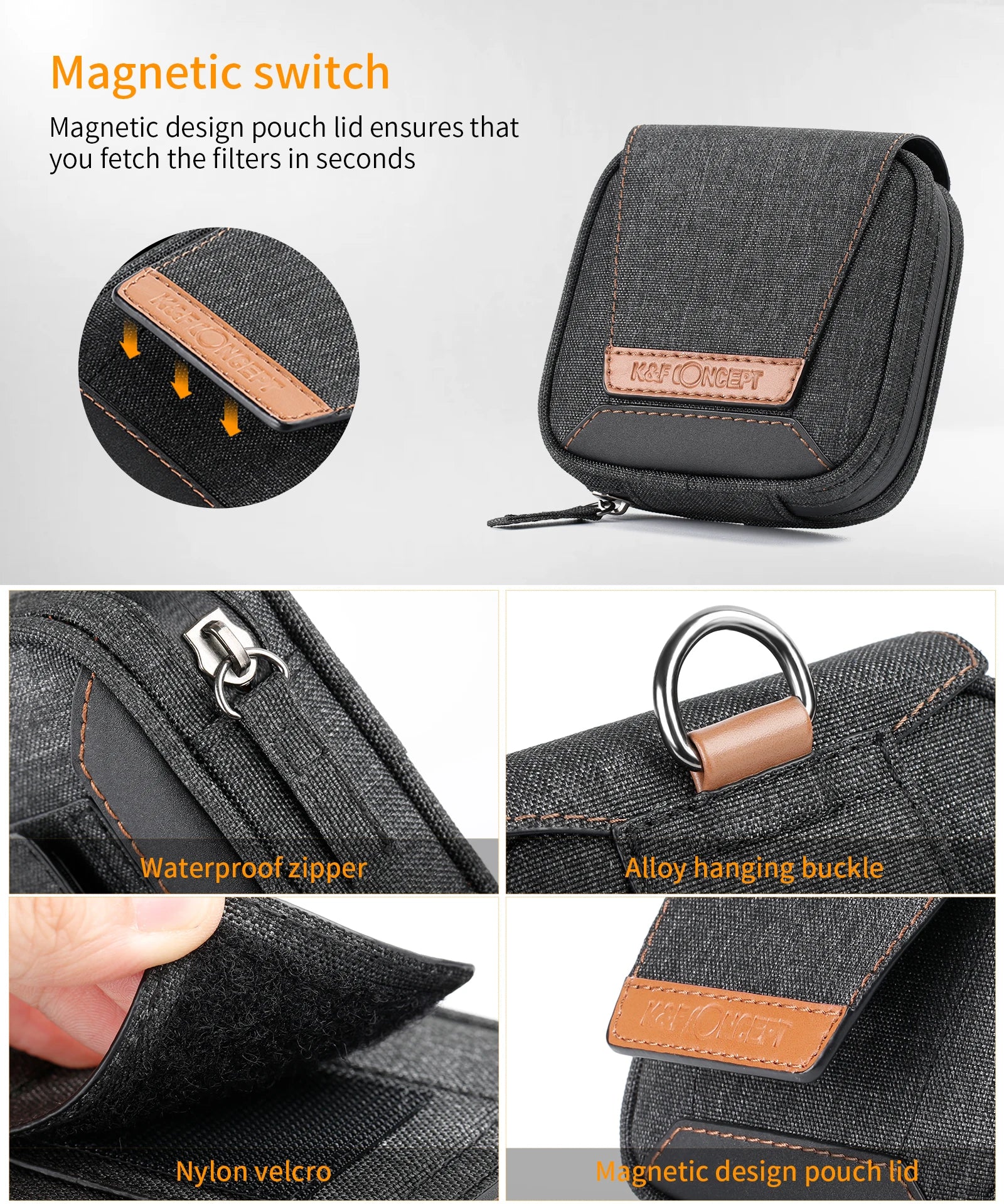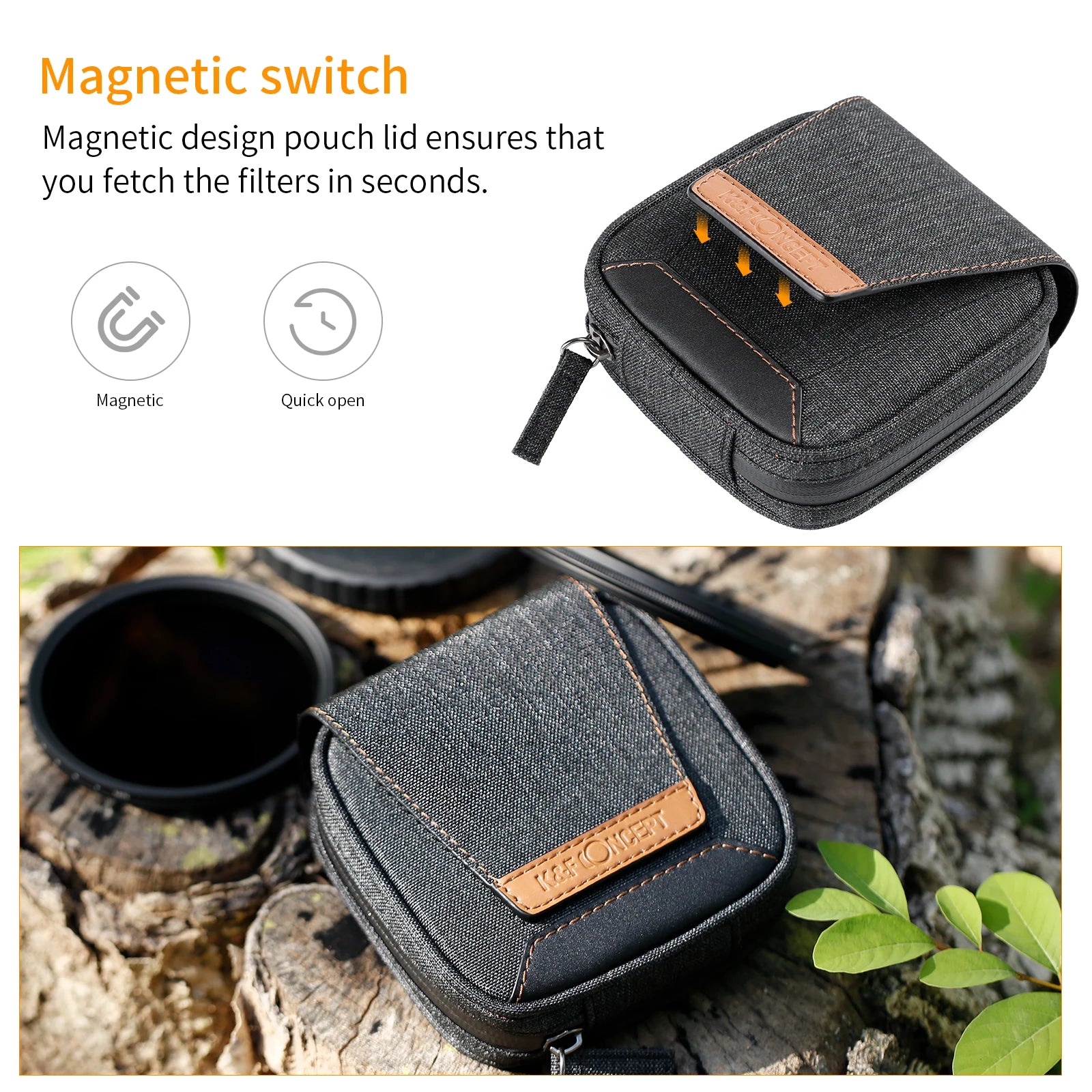 The case features a magnetic switch design for the pouch lid, ensuring that you can access your filters quickly and easily. This innovative feature allows you to retrieve your filters in seconds, making it incredibly convenient during photography sessions.