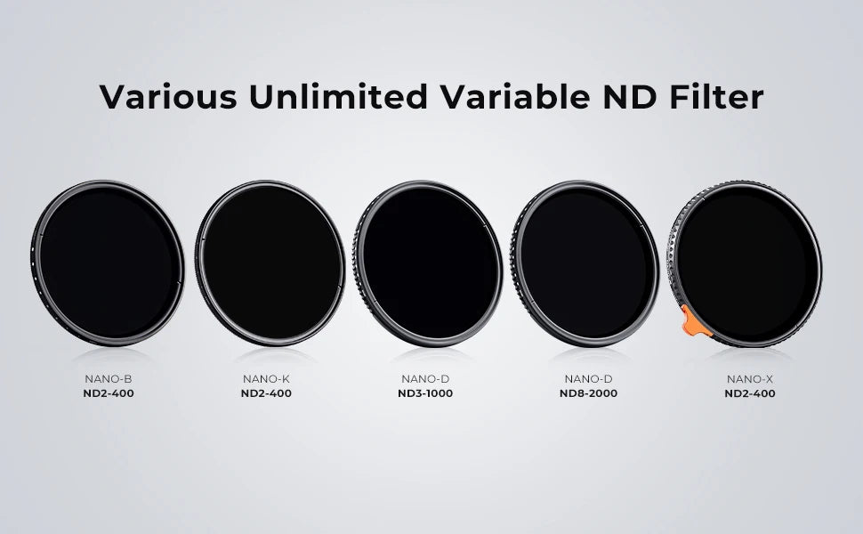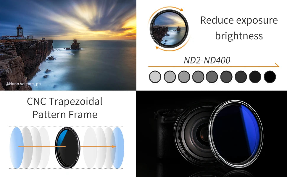 - Adjustable ND Range: From ND2 to ND400, smoothly control light reduction with a single filter, allowing flexibility in various lighting conditions without affecting color fidelity.