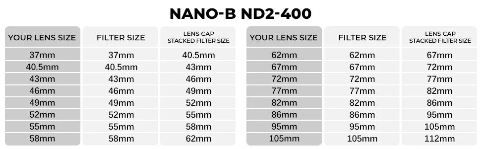 - Filter Type: Variable ND2-ND400, offering a light reduction of 1 to 9 stops.