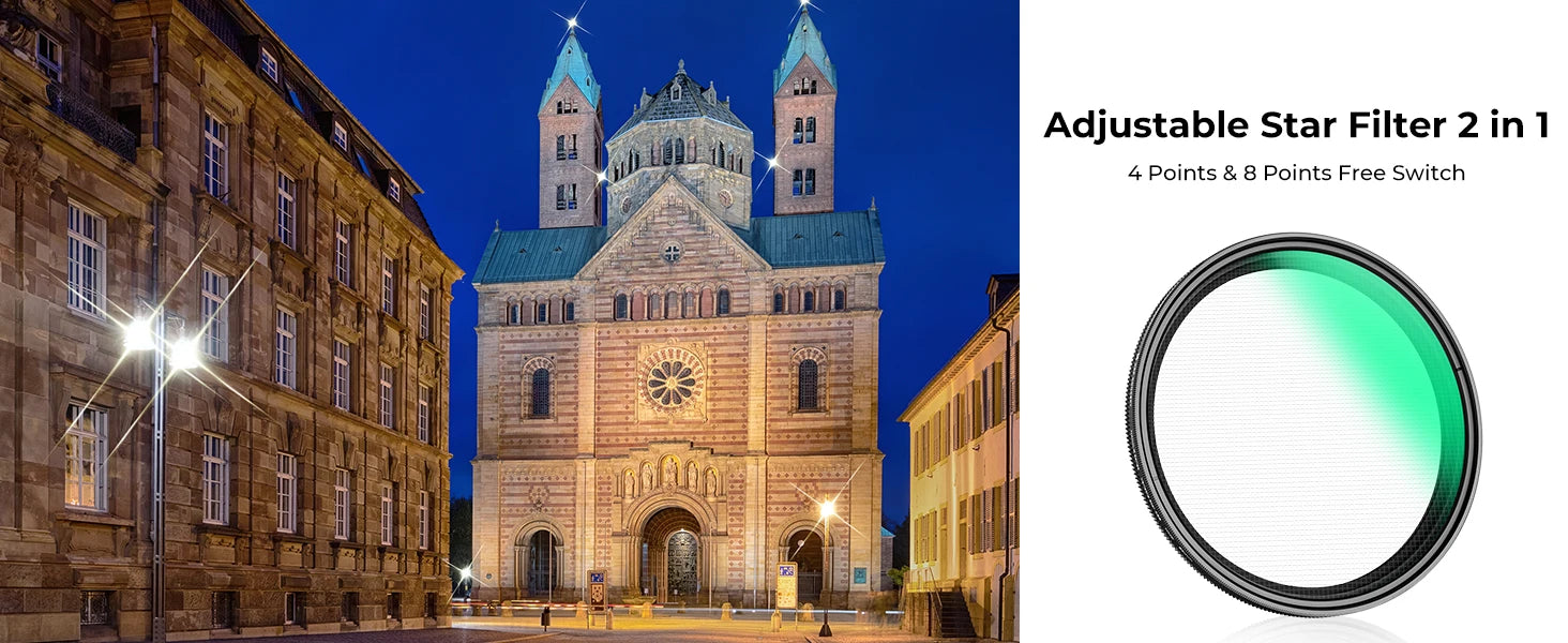 Enhance night scenes with mesmerizing starbursts around streetlights, cityscapes, or celestial objects. The adjustable star patterns of the K&F Concept Variable Star Filter add a magical touch to urban landscapes and nighttime portraits, creating captivating compositions.