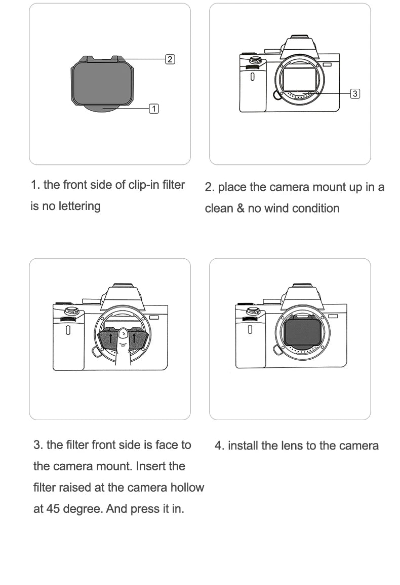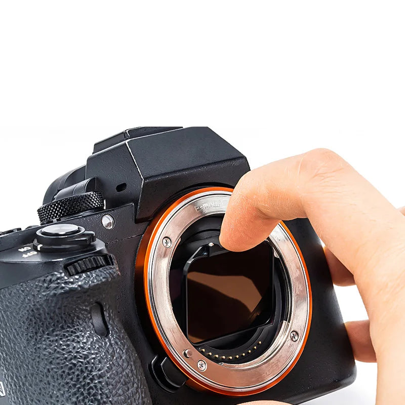 Effortlessly install these clip-in filters directly in front of your Sony Alpha camera's CMOS sensor. This integration preserves the functionality of the lens and adapter mount while safeguarding the light-reducing element and acting as a protective mirror for the CMOS sensor.