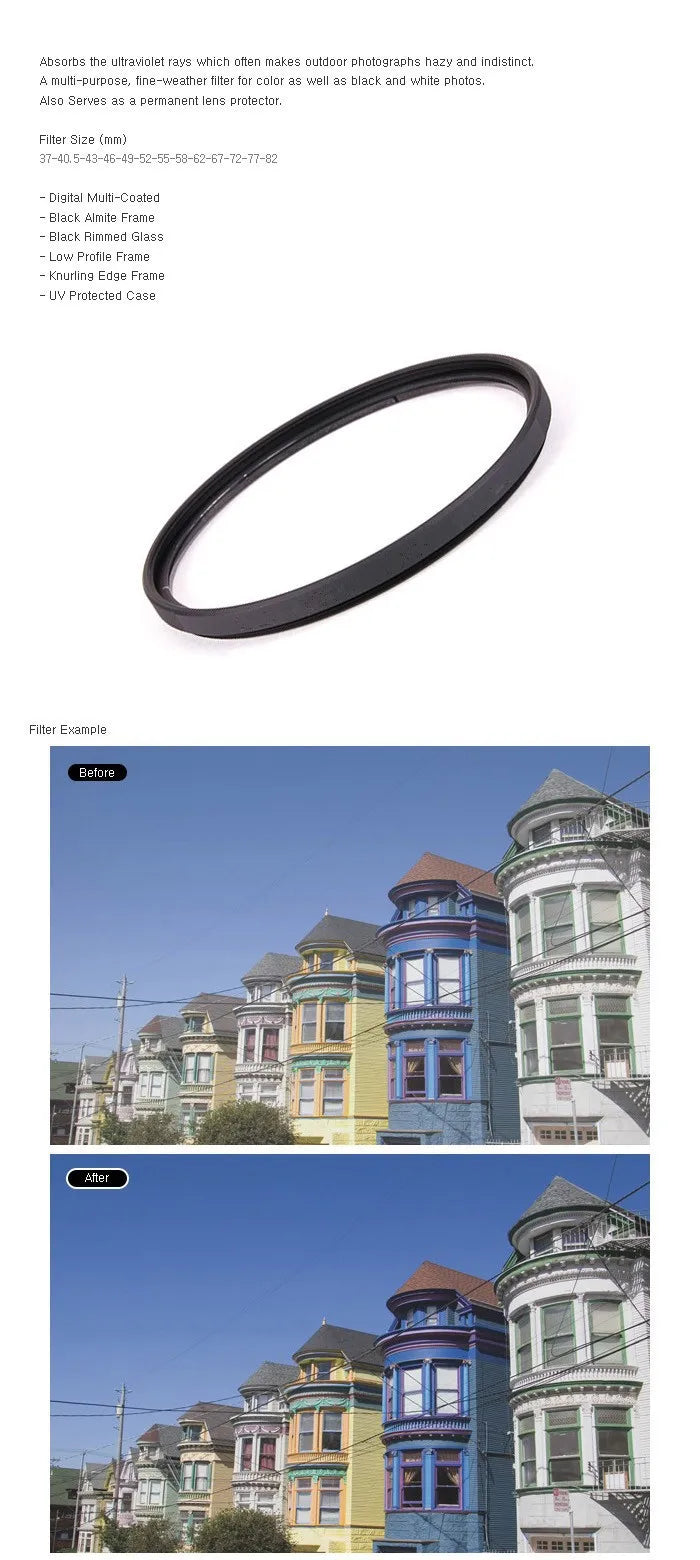 - UV Protection: Safeguard your lens from dust, moisture, and scratches while reducing UV light to improve image clarity.