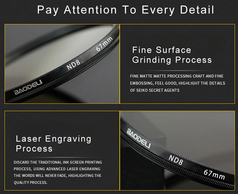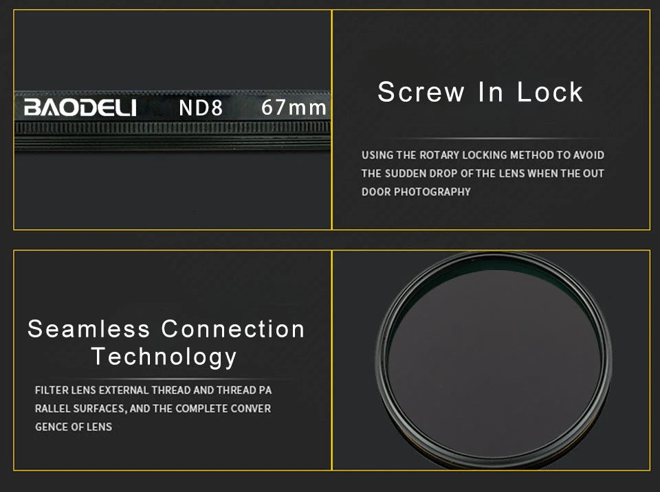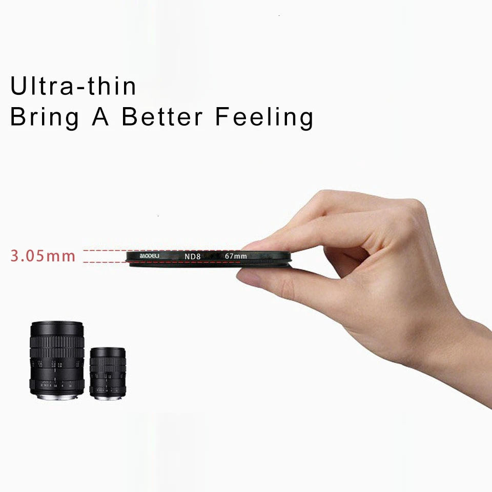 The BAODELI ND2, ND4, ND8 Filters are designed to provide photographers with precise control over light and exposure. Their high-quality materials, advanced optical technology, and durable construction make them a valuable tool for various photography styles. Whether you are capturing landscapes, portraits, urban scenes, or time-lapse videos, these filters help you achieve stunning results by controlling light and preventing overexposure.