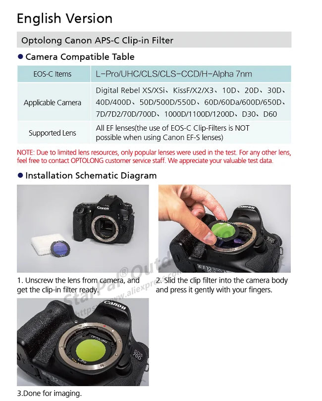 Compatible with EOS-C cameras such as 7D Mark II, 80D/800D, 77D/70D/760D/750D/700D 650D/600D, 550D/500D, 400D, 100D/1100D/1200D/1300D (Note: Not compatible with EF-S camera lenses), the OPTOLONG H-Alpha 7nm Filter ensures hassle-free installation and usage.
