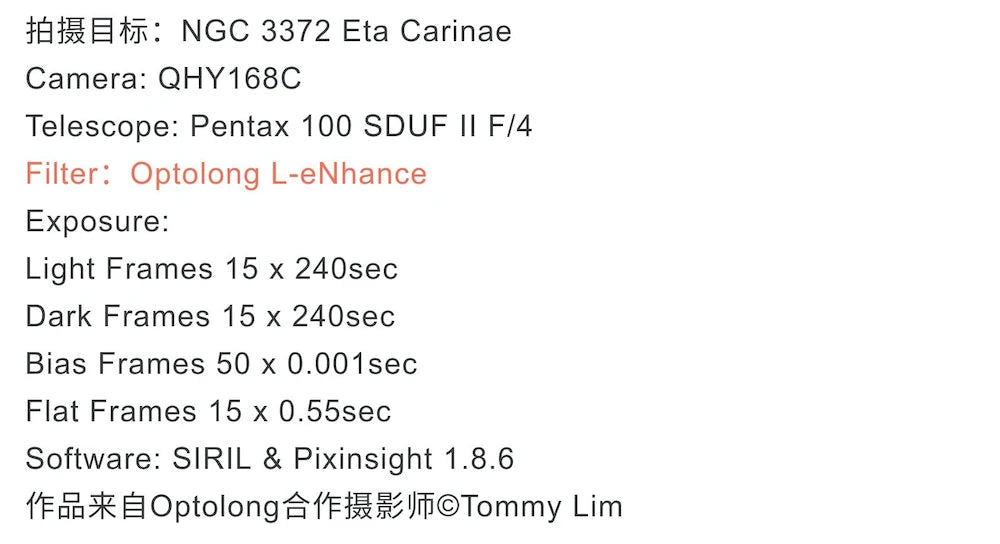 Note: Always observe safety warnings and avoid direct solar observation with the Optolong L-eNhance Filter.