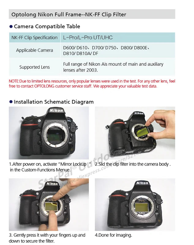 Here is a list of compatible cameras for the Optolong UHC/L-Pro Filter for Nikon NK-FF: