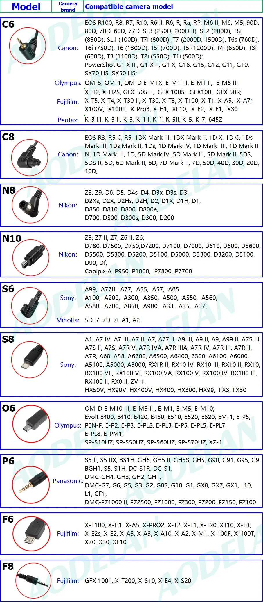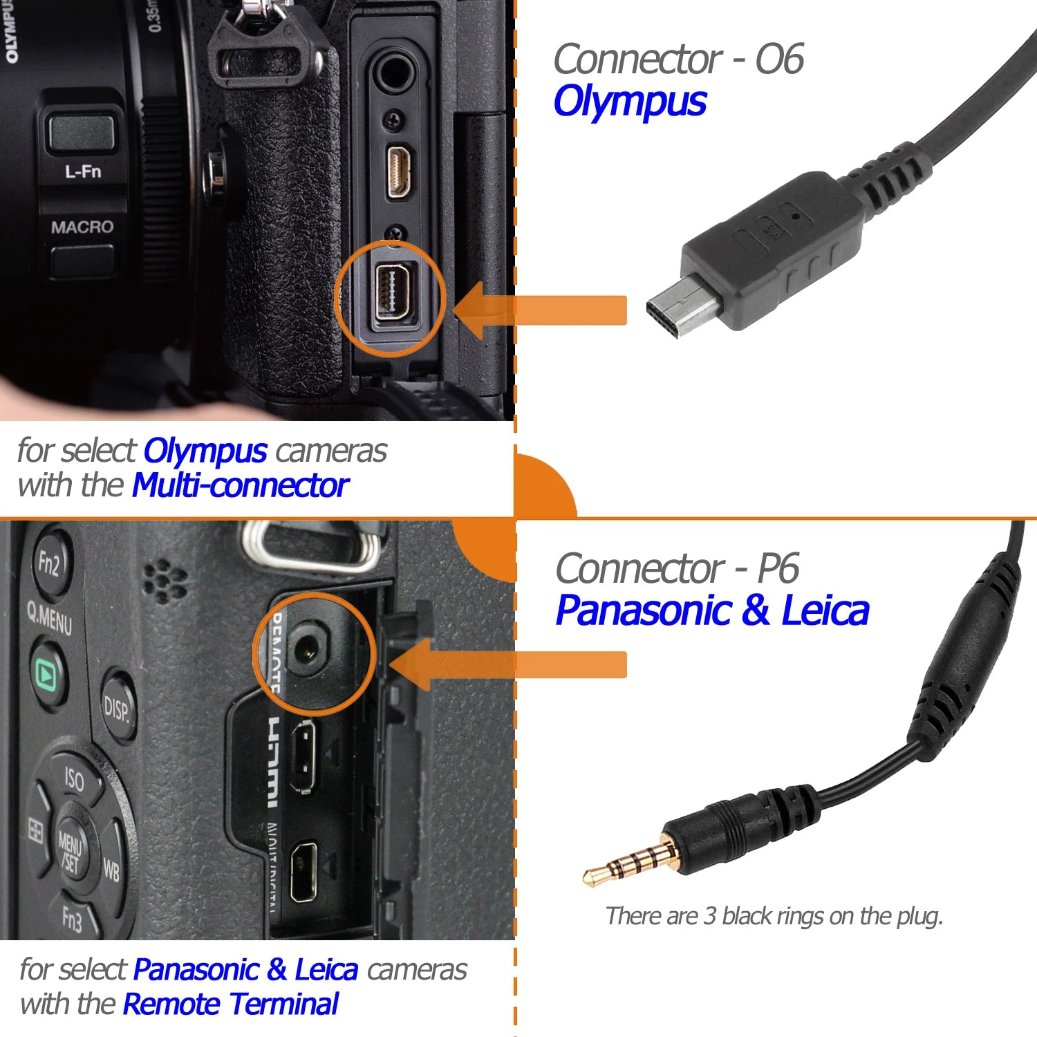 - Description: The O6 connector type is tailored for Olympus DSLR cameras that require a 2.5mm remote shutter release cable. It provides a secure and reliable connection, allowing photographers to operate the camera remotely for various photography applications.