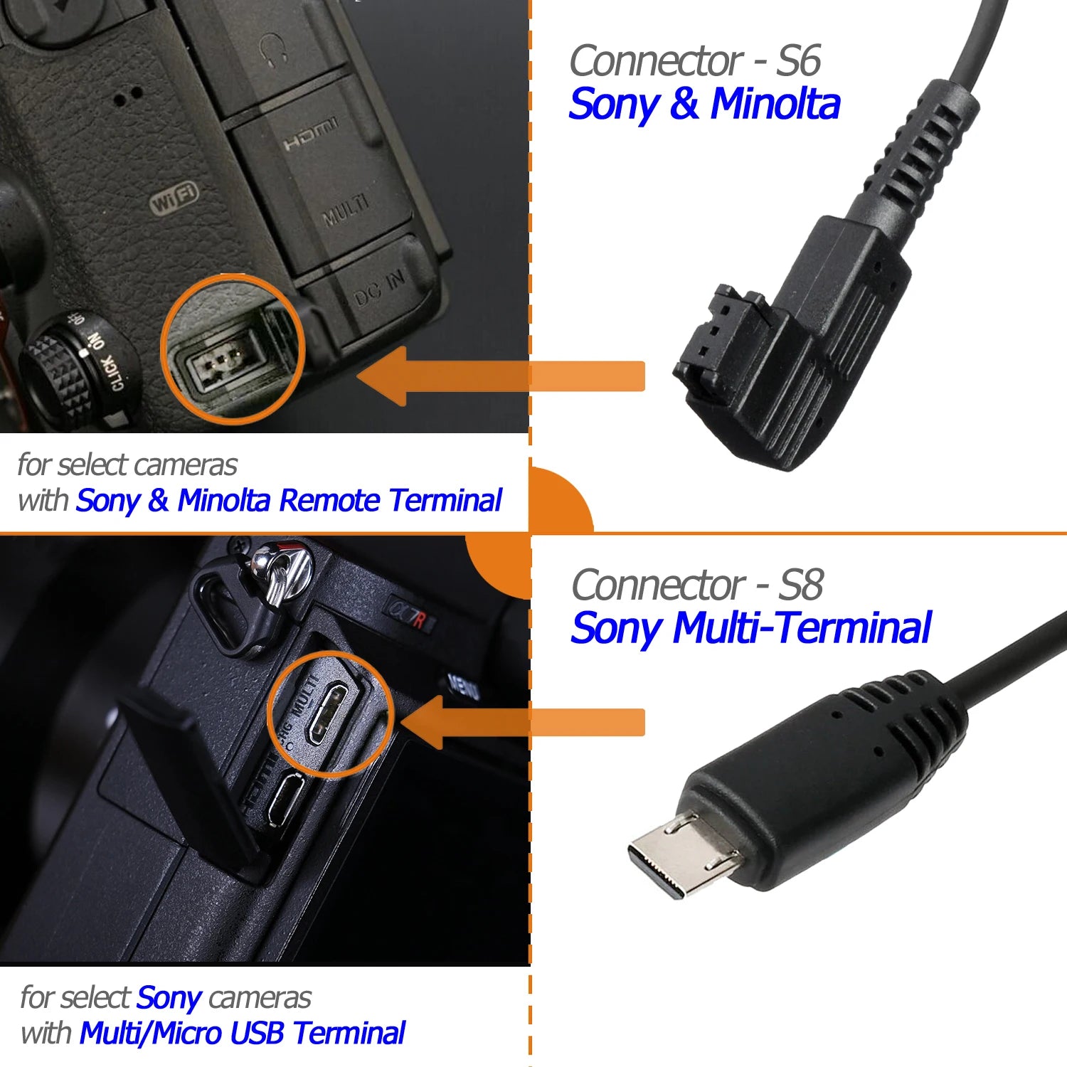 - Description: The S8 connector type is designed for Sony Alpha series and other Sony DSLR cameras that feature a 2.5mm remote shutter release input. It ensures seamless integration and allows photographers to trigger the shutter remotely, maintaining stability and minimizing camera movement.