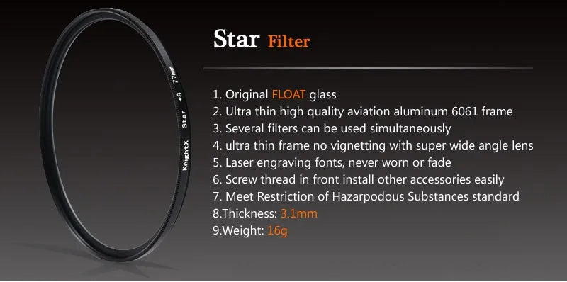 Crafted from high-quality optical glass, the Star Line 4 6 8 Filter ensures superior clarity and durability. It effectively suppresses reflections and increases light transmission, allowing you to capture sharp and detailed images while benefiting from the filter's special effects.