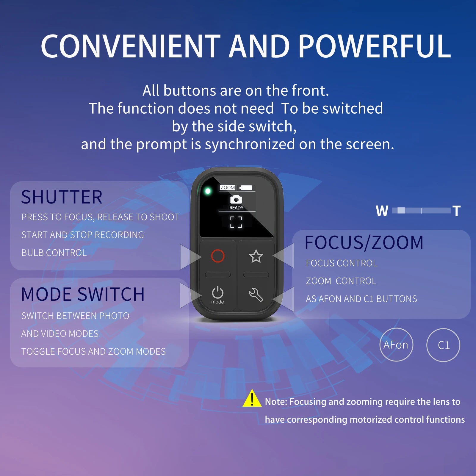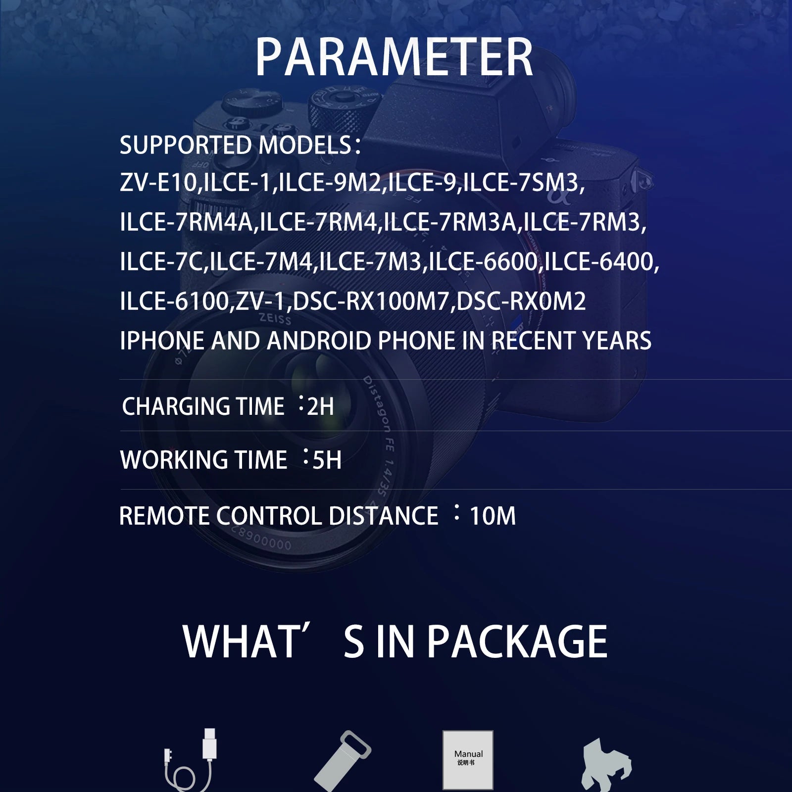 - Equipped with a rechargeable lithium battery, the remote can be conveniently charged via a USB cable. This eliminates the hassle of replacing batteries frequently and ensures continuous operation during extended shoots.