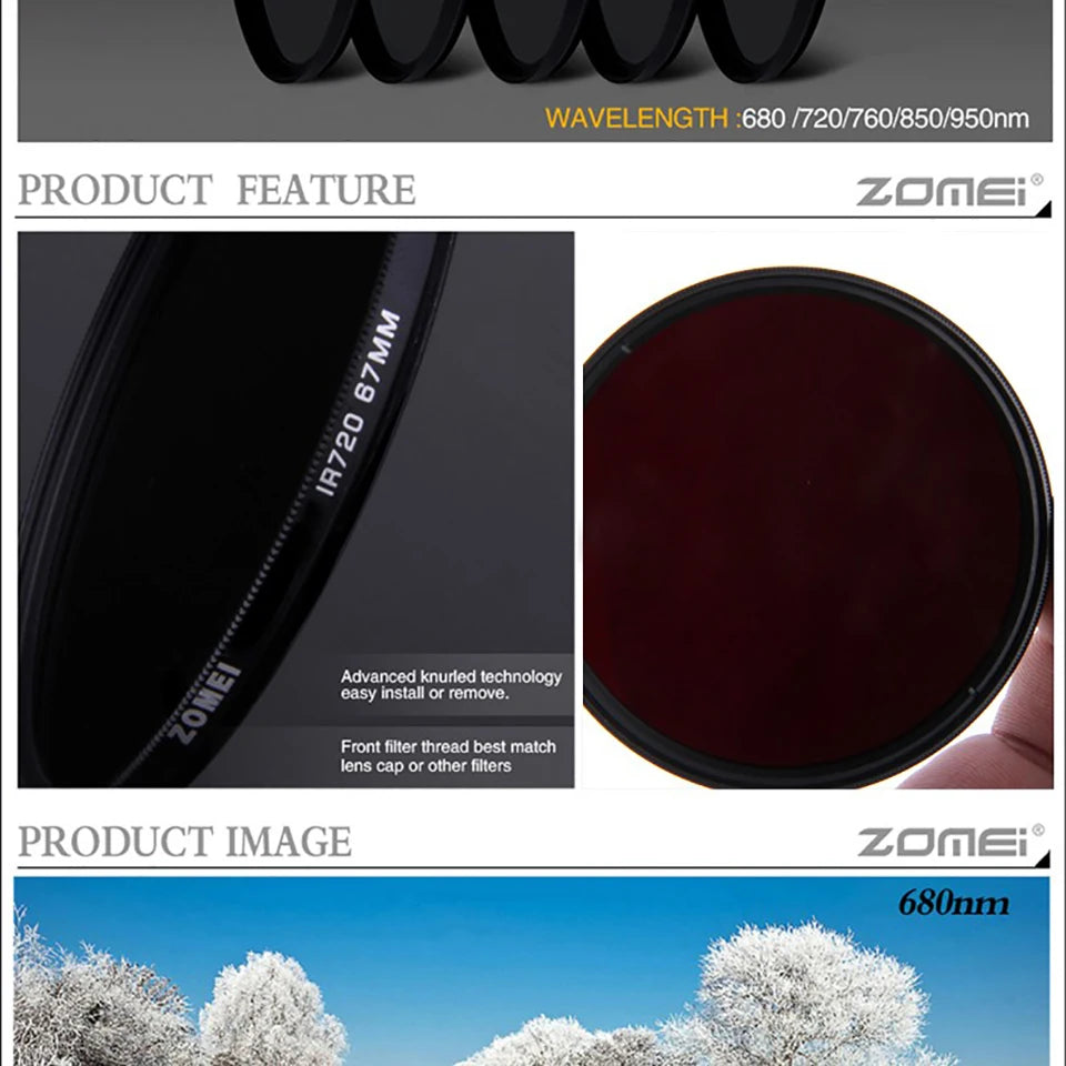 Zomei offers a range of IR filters with wavelengths including 680nm, 720nm, 760nm, 850nm, and 950nm, available in sizes from 37mm to 77mm. Each filter serves a specific purpose: